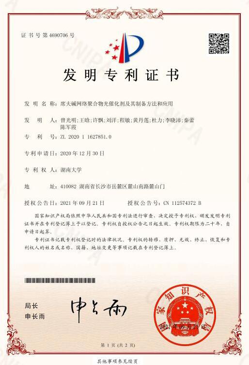 | 2017级博士生王晗、曾光明教授、许飘助理教授等申请的1项国家发明专利获得授权: 【发明人】:曾光明,王晗,许飘,刘洋,程敏,黄丹莲,杜力,李晓沛,秦蕾,陈军霞 【发明名称】:席夫碱网络聚合物光催化剂及其制备方法和应用 【申请日】:2020年12月30日 【授权日】:2021年09月21日 【专利号】:ZL 202011627851.0 【专利权人】:湖南大学 【摘要】: 本发明公开了一种席夫碱网络聚合物光催化剂及其制备方法和应用,该光催化剂是以三聚氰胺和邻苯二甲醛为原料,在1,4-二氧六环与均三甲苯混合溶液体系中发生缩聚反应后制备得到。本发明方法制得的席夫碱网络聚合物光催化剂具有比表面积高、反应活性位点多、光吸收范围宽、电子-空穴对复合率低、光催化性能好等优点,能够广泛用于降解有机污染物,且能够取得较好的降解效果,有着很高的使用价值和很好的应用前景;同时,本发明制备方法具有工艺简单、操作方便、原材料易得、成本低廉、制备效率高、产率高等优点,适合于大规模制备,利于工业化生产。 ![]() |