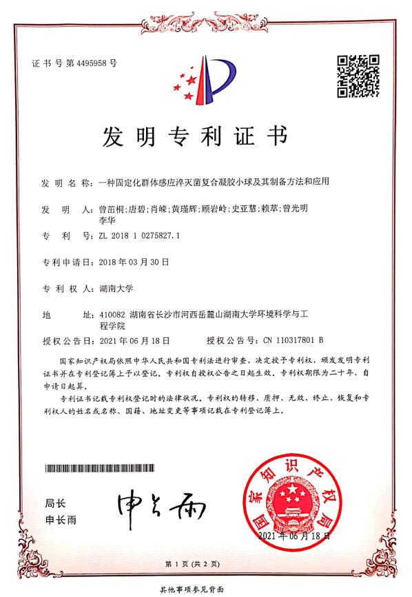 | 硕士生唐碧(导师:黄瑾辉教授、曾光明教授)、博士生曾茁桐(导师:肖嵘教授)等申请的1项国家发明专利获得授权: 【发明人】:曾茁桐,唐碧,肖嵘,黄瑾辉,顾岩岭,史亚慧,赖萃,曾光明,李华 【发明名称】:一种固定化群体感应淬灭菌复合凝胶小球及其制备方法和应用 【申请日】:2018年3月30日 【授权日】:2021年6月18日 【专利号】:ZL 201810275827.1 【专利权人】:湖南大学 【摘要】:本发明公开了一种固定化群体感应淬灭菌复合凝胶小球及其制备方法和应用,该复合凝胶小球包括由聚乙烯醇和海藻酸钠组成的凝胶小球,表面及内部负载有粉末活性炭和群体感应淬灭菌。其制备方法为:将聚乙烯醇、海藻酸钠、粉末活性炭与水混合,与群体感应淬灭菌菌悬液混合,所得混合液依次与硼酸和氯化钙的水溶液、硫酸钠溶液进行交联反应,得到复合凝胶小球。本发明复合凝胶小球具有成本低廉、传质性能好、机械强度高、分散性好、生物活性高、吸附能力强等优点,其制备方法具有制备工艺简单、操作简便、生产效率高、生产周期短、产品收益率高等优点。本发明复合凝胶小球能够有效去除群体感应信号分子AHL以及延缓膜污染效率,具有较好的应用前景。 ![]() |