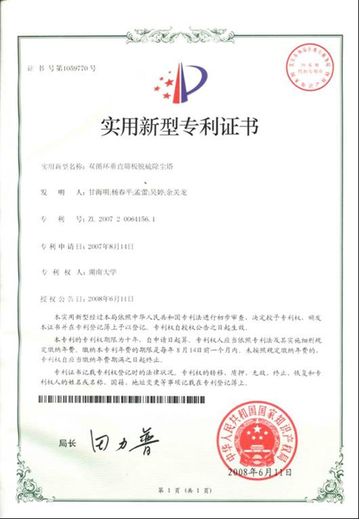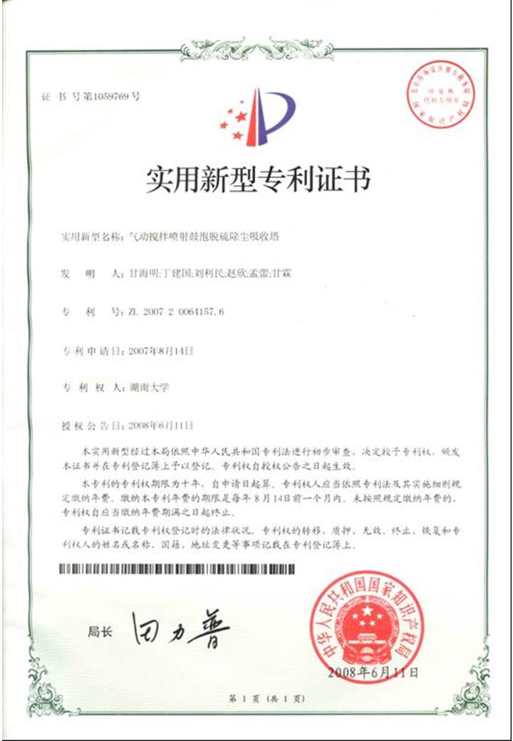 | 甘海明高工、杨春平教授、陈宏博士生等人申请的专利“垂直筛板喷射鼓泡脱硫除尘吸收塔”于2008年6月11日获得实用新型专利授权证书。 【发明人】:甘海明;杨春平;路培;陈宏;余关龙 【名称】:垂直筛板喷射鼓泡脱硫除尘吸收塔 【专利号】:ZL 200720064155.7 【申请日】:2007年8月14日 【授权公告日】:2008年6月11日 【摘要】:实用新型公开了一种垂直筛板喷射鼓泡脱硫除尘吸收塔,包括筒形塔壁、两端为开口状的外筒和内筒,所述外筒和内筒设于塔壁内部的下段并与塔壁同轴布置,外筒与内筒之间构成环形气体通道,外筒和内筒底端与塔壁有悬空间距,且下端沿圆周方向各开有一圈栅格状喷气孔,外筒和内筒顶端设有密封板,密封板通过加强筋与塔壁内壁固接,所述密封板下端装有第一螺旋喷嘴组,所述塔壁于密封板下方开有烟气进口,烟气进口内设有喷嘴,塔壁内部的上段设有第二螺旋喷嘴组,塔壁顶部设有净烟气出口。该垂直筛板喷射鼓泡脱硫除尘吸收塔利用了切向环流进气方式和旋风湿壁原理,可通过工业废水冷却烟气、去除灰尘。 甘海明高工、杨春平教授、孟蕾硕士、吴婷硕士生等人申请的专利“双循环垂直筛板脱硫除尘塔”于2008年6月11日获得实用新型专利授权证书。 【发明人】:甘海明;杨春平;孟蕾;吴婷;余关龙 【名称】:双循环垂直筛板脱硫除尘塔 【专利号】:ZL 200720064156.1 【申请日】:2007年8月14日 【授权公告日】:2008年6月11日 【摘要】:本实用新型公开了一种双循环垂直筛板脱硫除尘塔,包括设有筒底的外筒和两端为开口状的内筒,内筒设于外筒下段与外筒同轴布置,内筒与外筒间构成环形气体通道,内筒底端与外筒有悬空间距,且下端开有一圈栅格状喷气孔,内筒顶端通过密封板与外筒内壁固接,密封板下端装有第一螺旋喷嘴组,外筒设切线进气口,外筒上段设第二螺旋喷嘴组,外筒顶部设有净烟气出口,第二螺旋喷嘴组与内筒顶端间设带外循环溢流堰的垂直筛板,垂直筛板上开有筛板孔,筛板孔上方设有筛罩,筛罩下部设有筛罩孔,筛罩上部设有栅格状条形孔,筛罩孔与栅格状条形孔分别连通外筒上层。本实用新型具有脱硫效率高、不易堵塞、运行费用低、特别适用于回收含碱性脱硫剂的金属尾矿。 甘海明高工等人申请的专利“气动搅拌喷射鼓泡脱硫除尘吸收塔”于2008年6月11日获得实用新型专利授权证书。 【发明人】:甘海明;丁建国;刘利民;赵欣;孟蕾;甘霖 【名称】:气动搅拌喷射鼓泡脱硫除尘吸收塔 【专利号】:ZL 200720064157.6 【申请日】:2007年8月14日 【授权公告日】:2008年6月11日 【摘要】:本实用新型公开了一种气动搅拌喷射鼓泡脱硫除尘吸收塔,包括设有筒底的筒形塔壁、两端为开口状的外筒和内筒,所述外筒和内筒设于塔壁内部的下段并与塔壁同轴布置,外筒和内筒底端与塔壁有悬空间距,且下端沿圆周方向各开有一圈栅格状喷气孔,外筒和内筒顶端设有密封板,密封板通过加强筋与塔壁内壁固接,所述密封板下端装有第一螺旋喷嘴组,外筒与内筒之间构成环形气体通道,于密封板下方设有与环形气体通道相通的烟气进口,环形气体通道内设有浮筒,浮筒上部设有帆,下部设有桨。该气动搅拌喷射鼓泡脱硫除尘吸收塔具有塔内气体分布均匀、可对塔内气固液充分搅拌的优点。 ![]() ![]() ![]() |